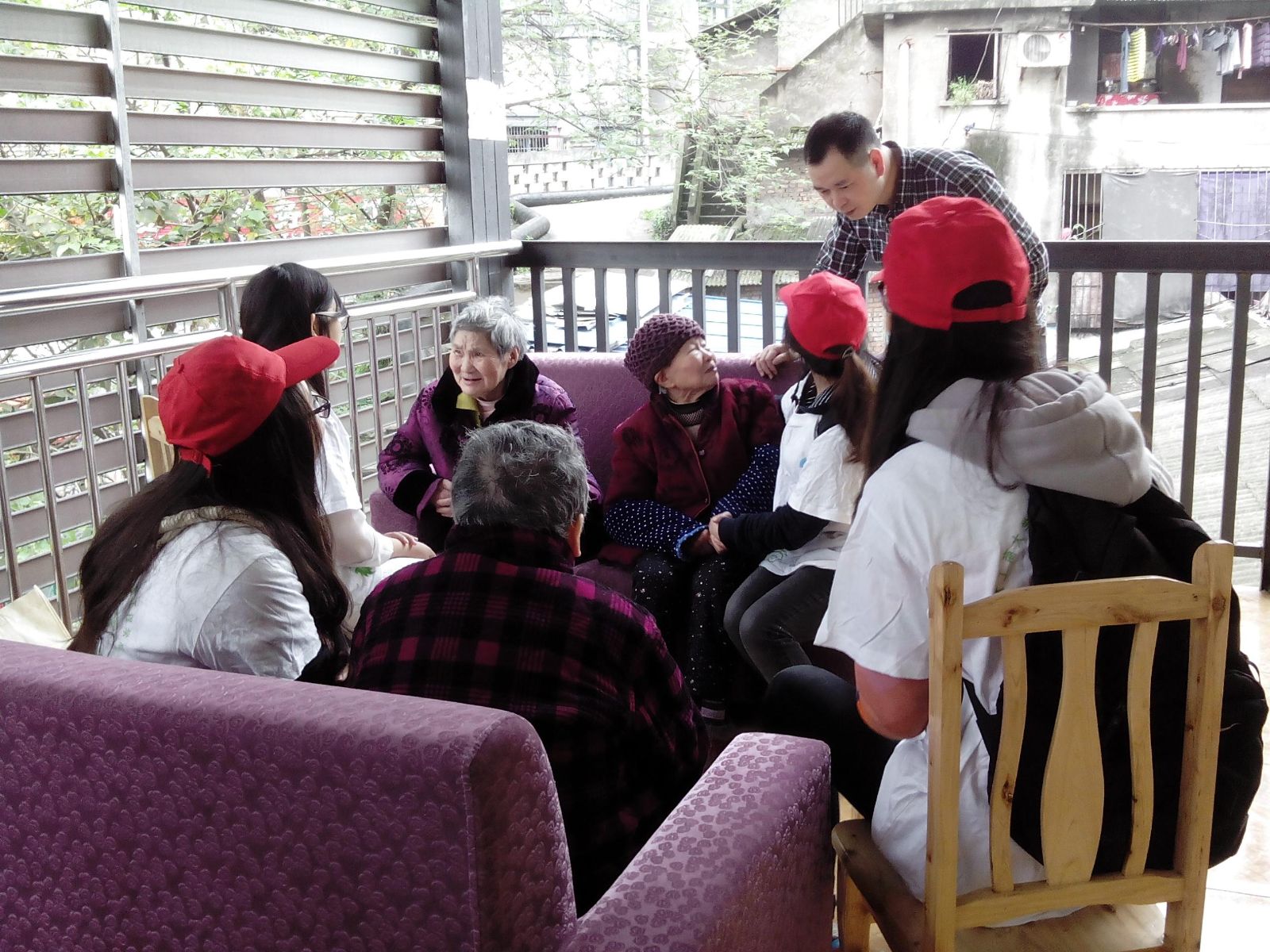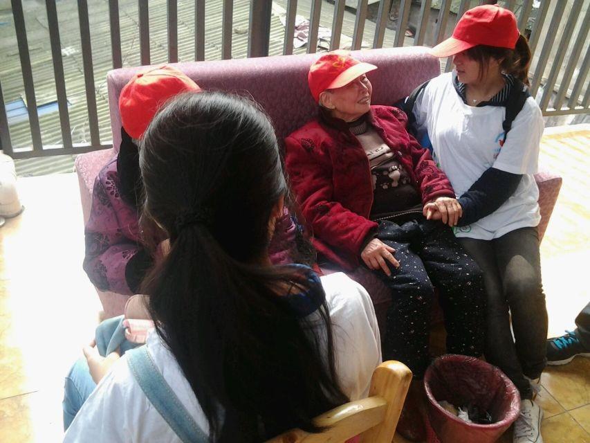 到达目的地,养老院的经理向我们介绍了概况,对于这个初生的养老院,他很高兴能与志愿者们合作,让老人们在平时的生活中更加快乐。活动中,我们主要是陪伴老人聊天,聊一下他们那个年代的生活情况,我们也会适时谈一些现在生活中的一些琐事,其中一个老人曾是地下党成员,他向我们讲解了一些当时战争的概况,志愿者们都由衷佩服那位老人。有几位老人喜欢唱歌,志愿者们和他们一起唱起了歌,而不会唱的老人,志愿者们拉着他们的手亲切而耐心的教他们,阳光印下,照亮了这片欢乐之地。在老人们吃完饭之后,志愿者协助院中的工作人员帮助他们整理房间,帮助他们洗碗、扫地,一颦一足都展现了志愿者们对老人们的关爱。活动的最后,志愿者们和经理留影,记录了这温馨的一刻。