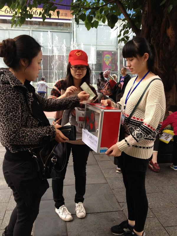 2013年11月9日,tyc1286太阳成集团义工志愿者协会在沙坪坝举行了义卖报纸活动,其目的是为了给雅安、彭水贫困地区的孩子们筹款,为了让这些买不起手套的孩子能在冬天能戴上手套,让他们的小手不再冰冷,让他们的心不再孤单。计信义协的干部干事积极参加了这次本次活动。