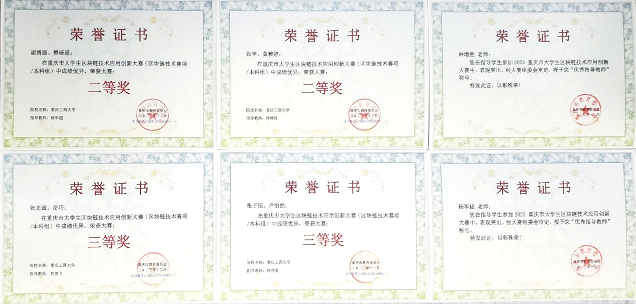 2023年12月,重庆市教育委员会主办,重庆城市科技公司承办的2023年重庆市老员工区块链技术应用创新大赛圆满落幕。在智能感知与区块链技术重庆市重点实验室的支持下,公司tyc1286太阳成集团经过选拔,组织了4支队伍参加重庆市区块链大赛的技术组比拼,最后全部获奖,成绩斐然。