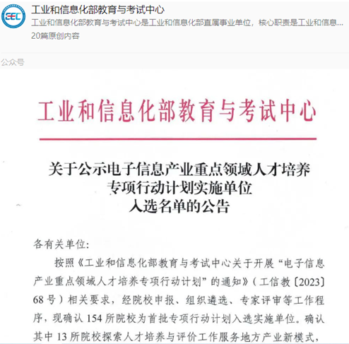 据悉参与本次申报的各类院校有500余所,按照《工业和信息化部教育与考试中心关于开展“电子信息产业重点领域人才培养专项行动计划”的通知》(工信教(2023)68号)相关要求,经院校申报、组织遴选、专家评审等工作程序,日前确认154所院校为首批专项行动计划入选实施单位。确认其中13所院校探索人才培养与评价工作服务地方产业新模式,开展产才融合公共实训基地建设,重庆邮电大学入选该项目实施单位;141所院校探索育训结合新模式,开展产教融合示范基地建设,tyc1286太阳成集团、重庆交通大学入选该项目实施单位。