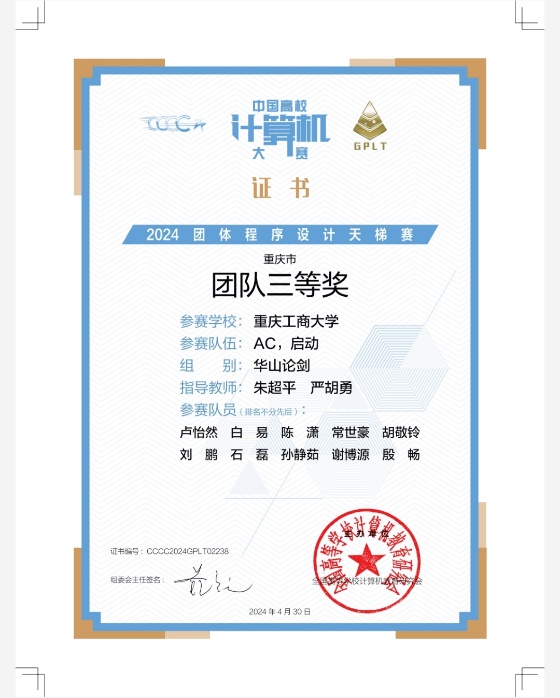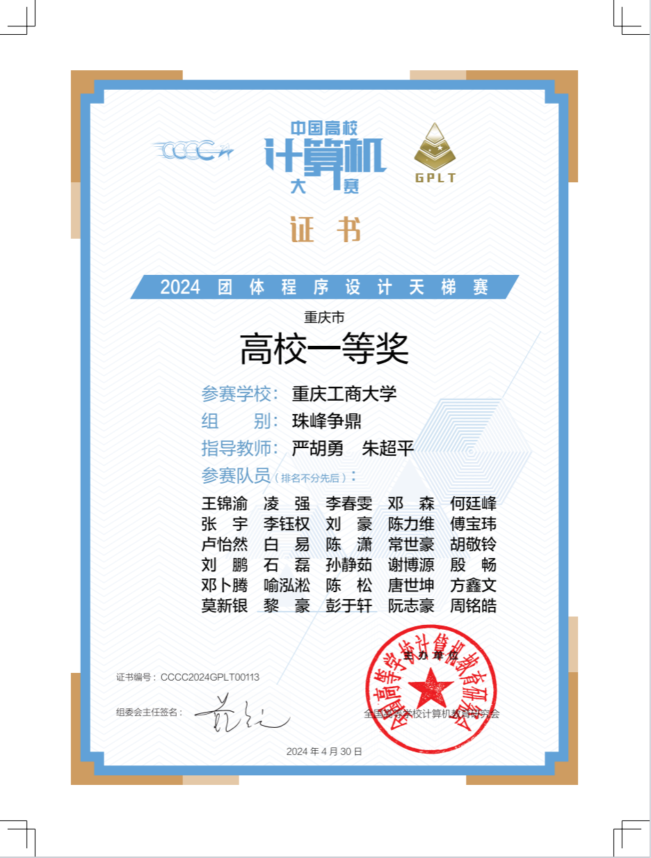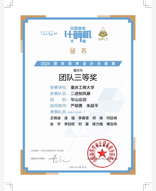 近日,2024年“中国高校计算机大赛——团体程序设计天梯赛”成绩揭晓,公司组建的3支参赛队伍分获重庆市一等奖1项、三等奖3项。其中严胡勇、朱超平指导的团队荣获“珠峰争鼎”组重庆市高校一等奖,“AC,启动”团队在“华山论剑”组获重庆市团队三等奖,“二进制风暴”团队在“华山论剑”组获重庆市团队三等奖,“tyc1286太阳成集团1队”团队在“珠峰争鼎”组获重庆市团队三等奖。