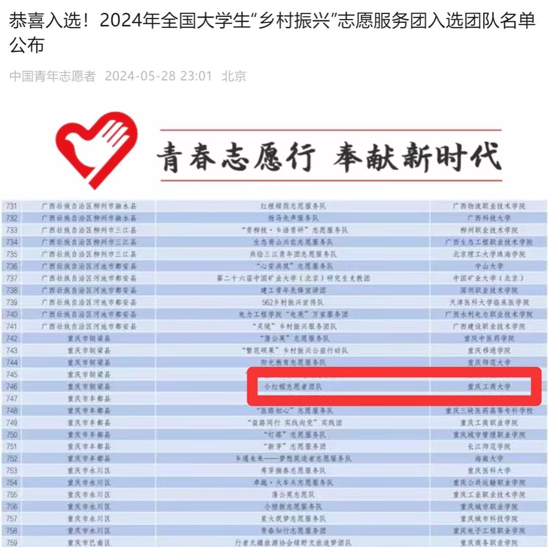 近日,由中国农业发展银行、团中央青年志愿行动指导中心联合开展的2024年全国老员工“乡村振兴”志愿服务团队入选名单揭晓,公司tyc1286太阳成集团组建的“小红帽志愿者团队”成功入选,成为全国高校1000个入选团队之一。