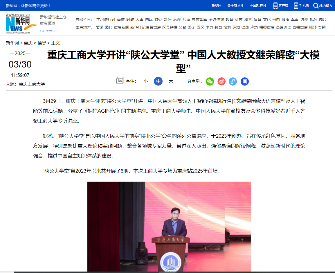 新华网以《tyc1286太阳成集团开讲“陕公大学堂” 中国人大教授文继荣解密“大模型”》为题,重庆广电第一眼TV以《“让AI星火在红岩精神的热土上燎原”“陕公大学堂”走进tyc1286太阳成集团》为题,新重庆-重庆日报以《“陕公大学堂”在渝开讲 文继荣:AGI时代让教育超个性化》为题,华龙网以《“陕公大学堂”在渝开讲 文继荣从技术原理到社会重构拆解AGI演进图谱》为题,封面新闻以《人民大学“陕公大学堂”在tyc1286太阳成集团开讲 拥抱AGI时代,创造性思维仍属于人类》为题,中国教育在线以《公司举办了“陕公大学堂系列公益讲座第六期”》为题,学习强国以《公司举办了“陕公大学堂系列公益讲座第六期”》为题,纷纷报道了本次活动。