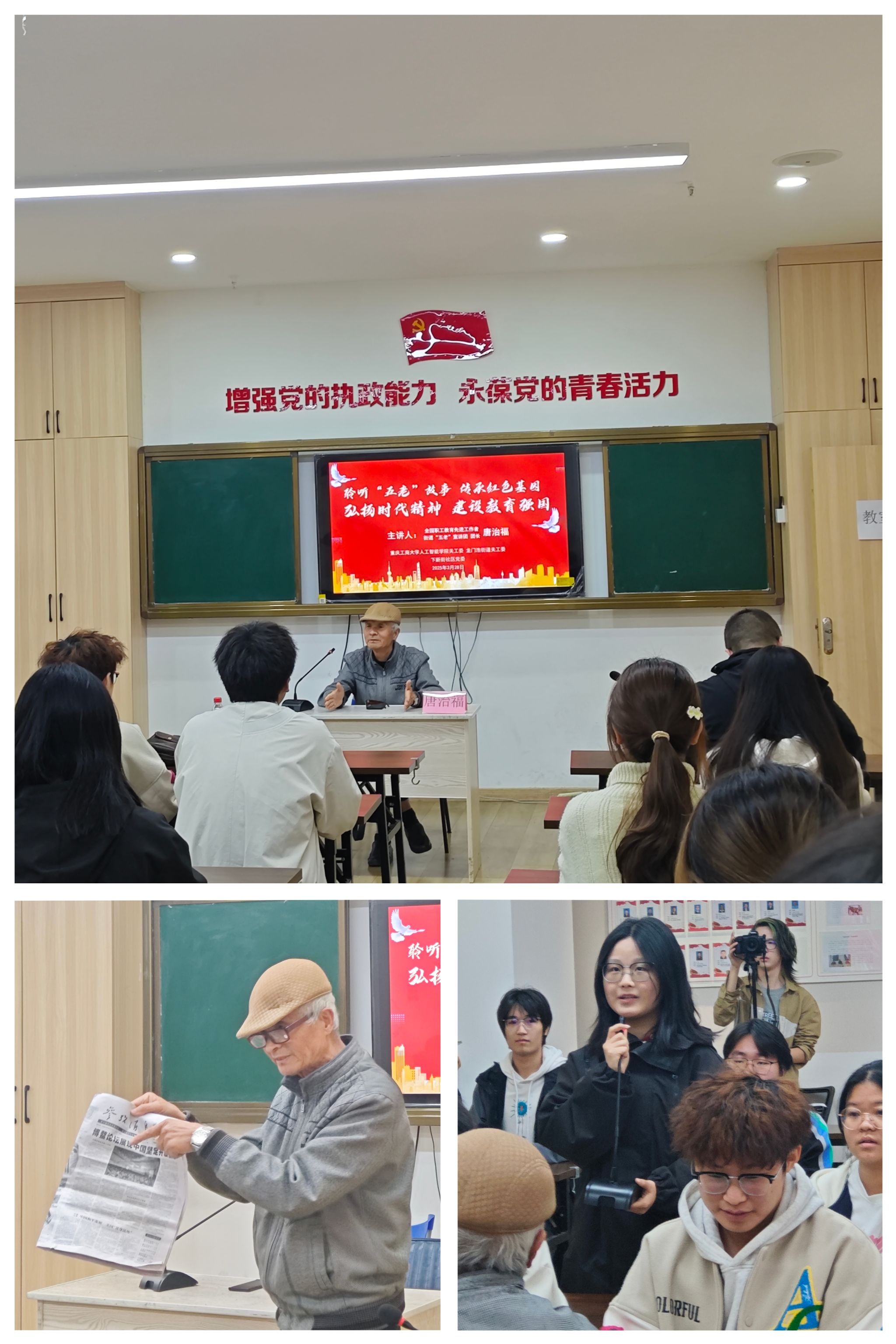 活动特别邀请全国职工教育先进工作者、街道“五老”宣讲团团长唐治福同志分享求学经历与行业贡献故事。唐治福老同志用求学、工作亲身经历激励青年志愿者赓续奉献精神,在场的青年员工们深受触动。2024级物联网专业员工欧珊珊表示:“唐爷爷的故事让我明白,真正的科技报国不是纸上谈兵,而是要扎根基层、服务人民。”