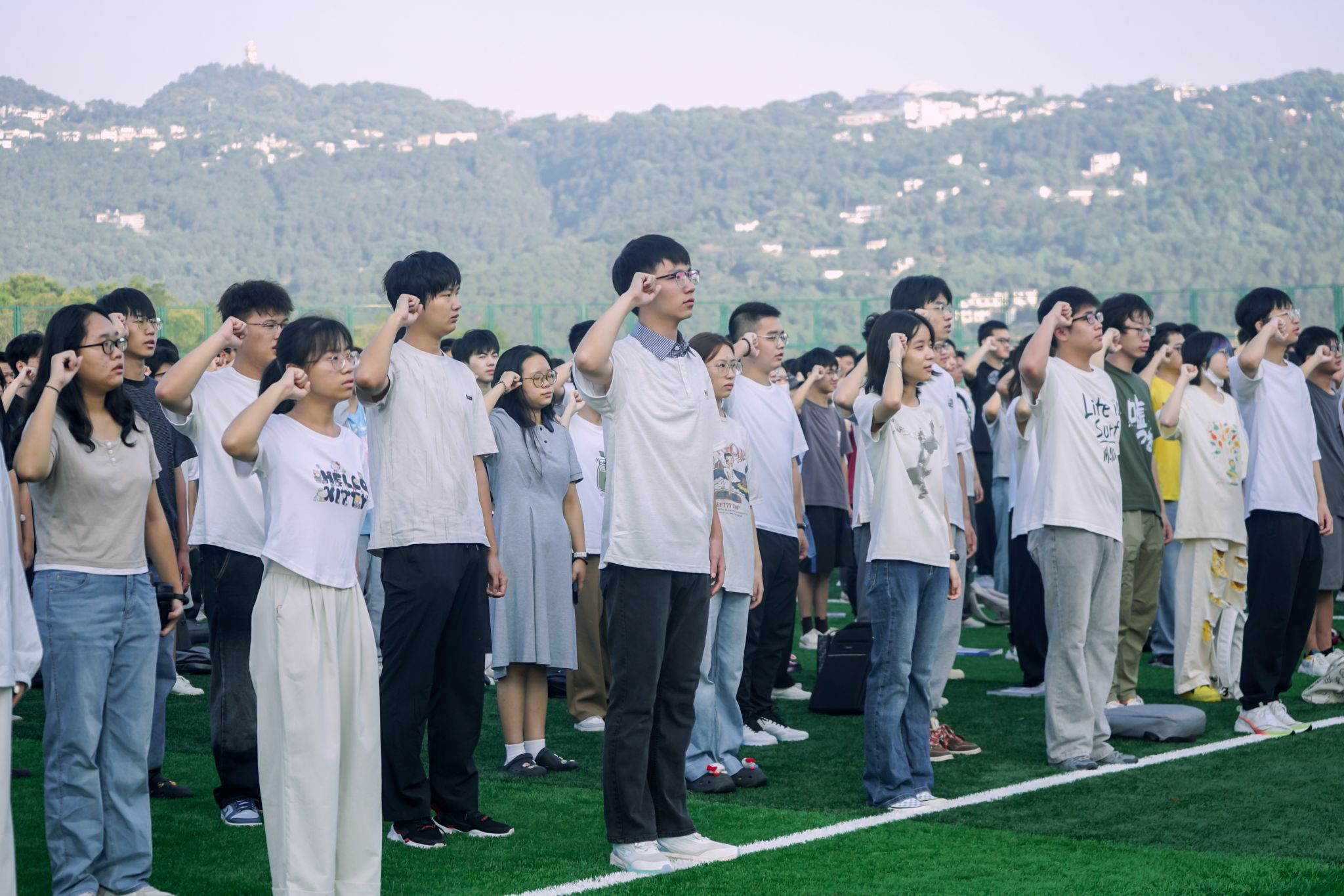 在集体宣誓环节,全体同学紧握右拳、神情庄严,齐声宣誓:“热爱祖国,不负韶华,为实现中华民族伟大复兴贡献力量!”誓言铿锵,尽显青春担当。这既是同学们对理想信念的郑重承诺,更是对在新校区逐梦未来的庄严约定。同学们将以这份誓言为指引,在这片沃土上奋力逐梦。