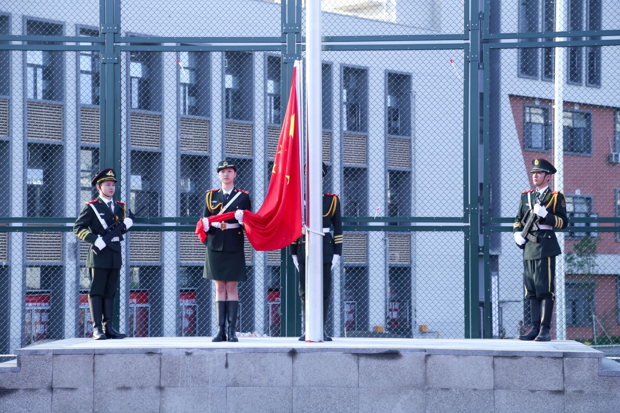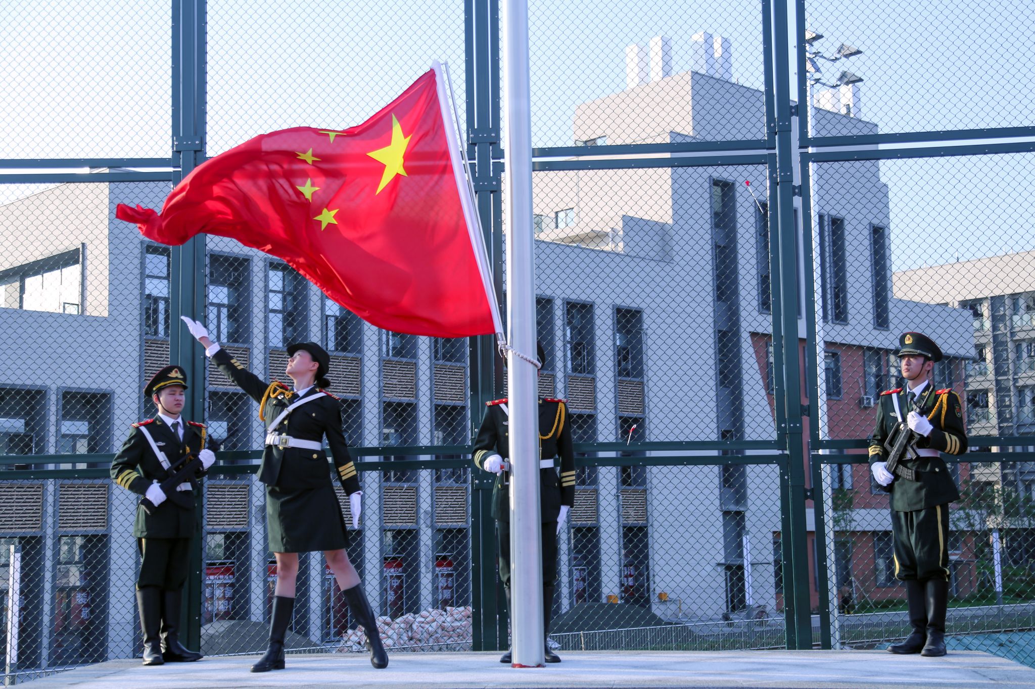 早上7时40分,伴随着雄壮豪迈的国歌声,五星红旗冉冉升起,红色旗面在风中徐徐舒展,迎风飘扬于高空。现场全体成员肃立,目光聚焦于鲜艳的五星红旗,庄重行注目礼。