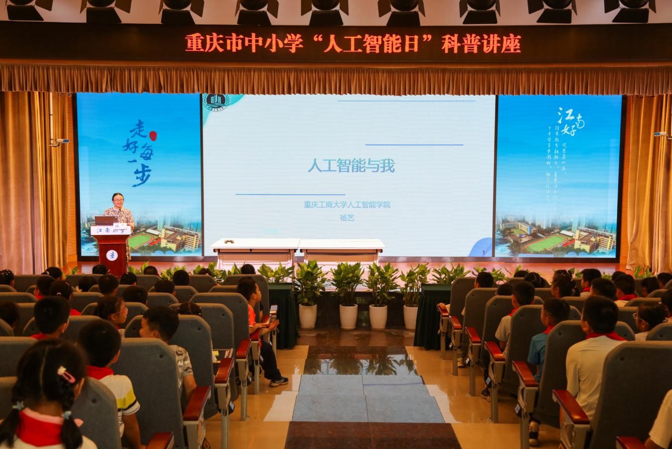 为帮助同学们厘清技术边界,杨艺教授结合“图灵测试”理论与AlphaGo围棋对战经典案例,清晰阐释弱人工智能与强人工智能的区别;同时,通过普渡科技“欢乐送”机器人服务场景、远程智能家电操控演示、社区健康AI检测设备介绍,以及AI辅助解读文言文、生成示意图、分析学习错题等教育应用实例,全方位展现人工智能服务生活、赋能学习的多元价值。讲座中穿插的AI科普3D动画,更贴合小员工认知特点,让复杂知识变得直观易懂。