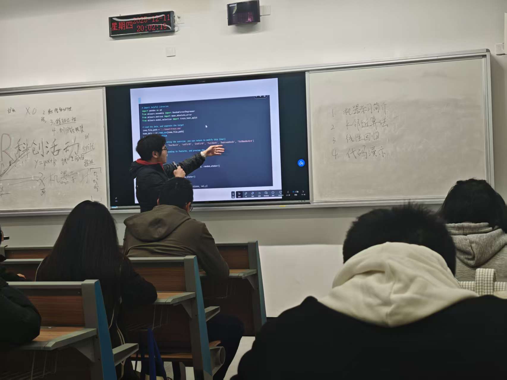 在代码实操部分,2024级人工智能二班刘震航同学首先回顾了机器学习实验的一般流程,包括任务定义、数据采集、数据处理、特征工程、数据划分、模型定义、模型训练、模型评估等,并现场进行了代码逐行解读与运行演示,强化了理论与实践的结合。