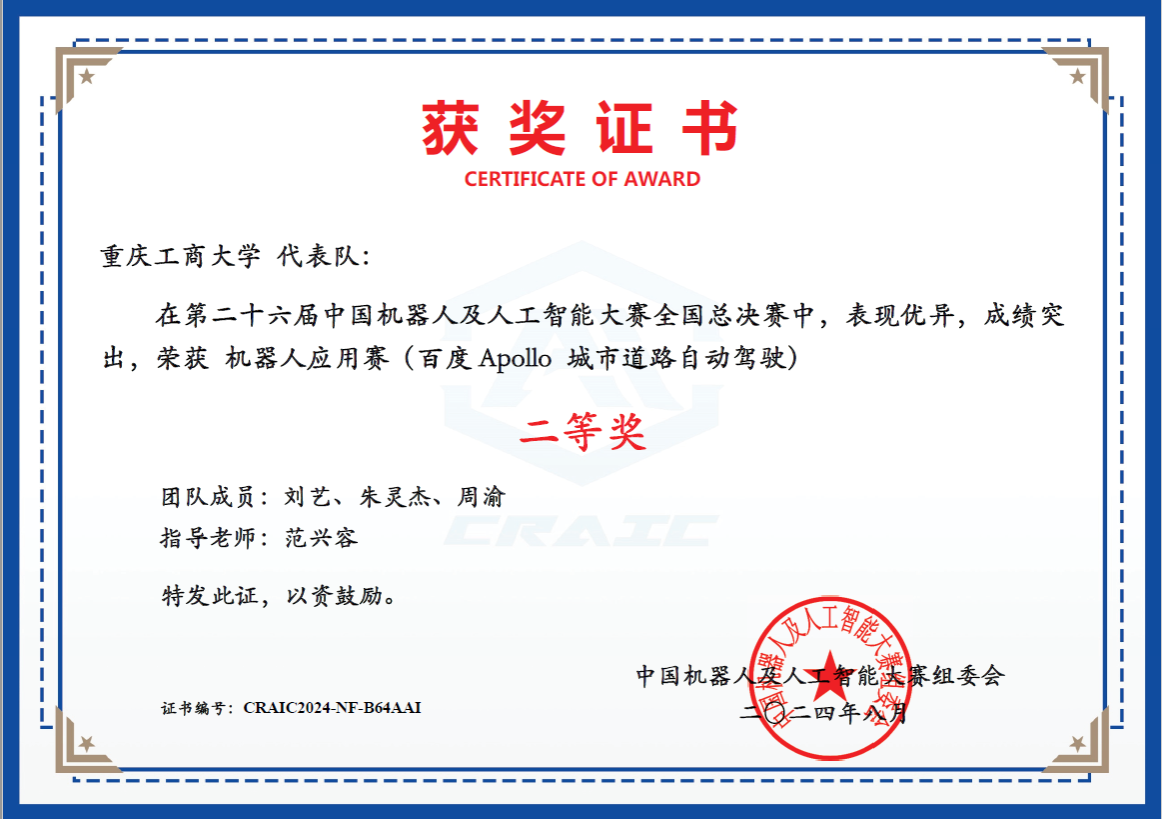 8月25日,第二十六届中国机器人及人工智能大赛全国总决赛在江苏宜兴成功举行。来自清华大学、哈尔滨工业大学、浙江大学等208所高校的407支队伍、1300余名选手,就自动驾驶、机器人、人工智能等领域的前沿技术展开激烈角逐和技术交流。此次盛会吸引了超过200位机器人与人工智能领域的专家学者、行业精英,共同探讨前沿技术与实际应用。在此次大赛中,公司tyc1286太阳成集团AI机器人科创团队表现优异,在“百度Apollo城市道路自动驾驶”赛项中斩获全国二等奖(团队成员:刘艺、朱灵杰、周渝,指导教师:范兴容)。