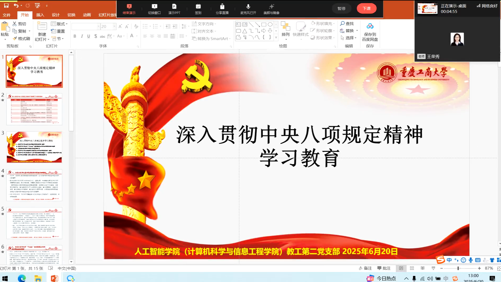 2025年6月20日,教工第二党支部组织了一场政治理论学习活动,活动通过企业微信线上直播的方式进行,由支部书记王荣秀同志主持。此次活动分为两个环节,分别是主题党日活动和支部书记讲党课,内容丰富、形式多样,旨在深入贯彻中央八项规定精神,提升党员的政治理论水平。