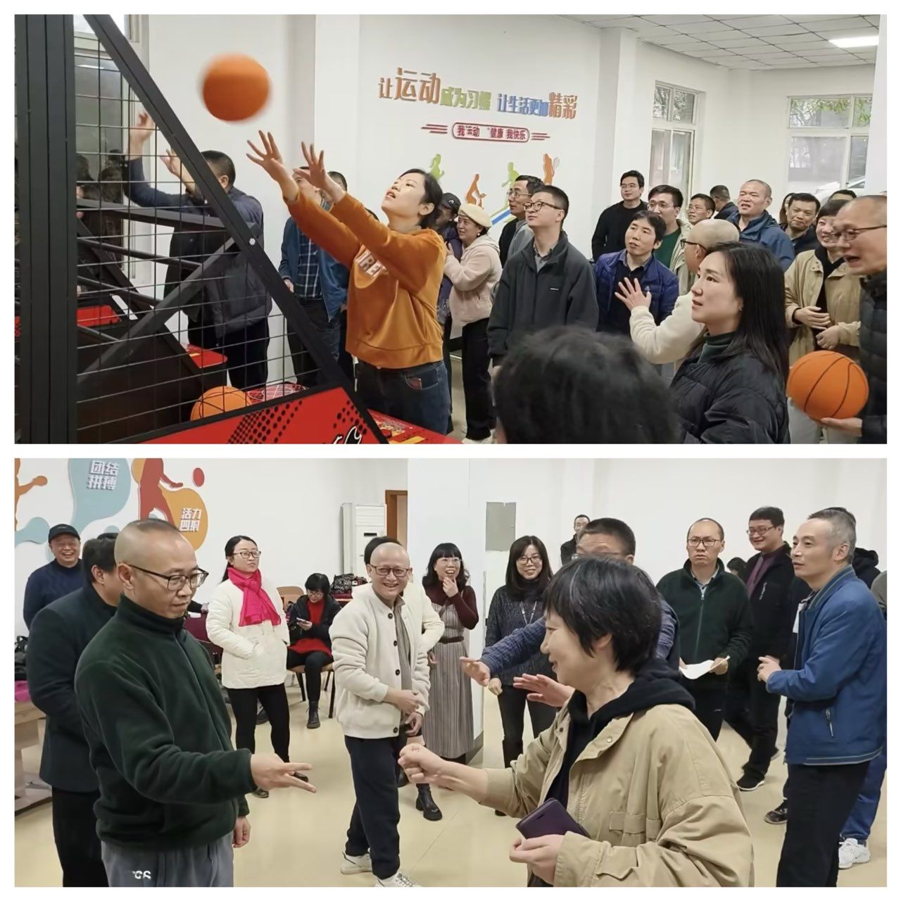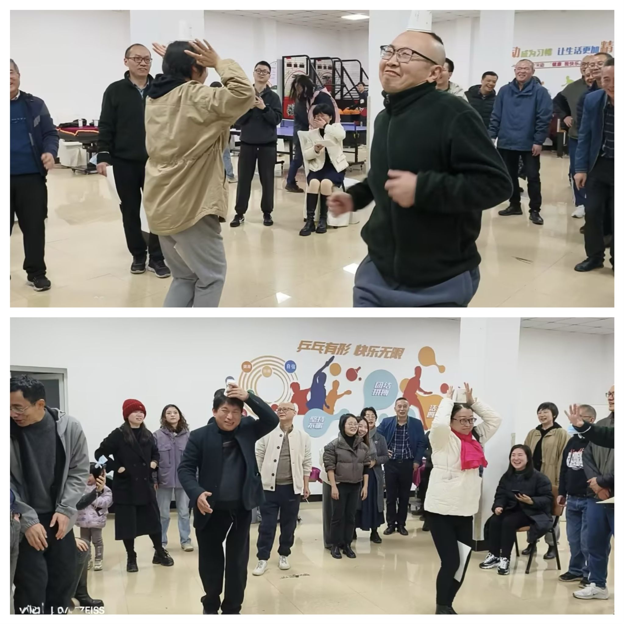 接下来的“投篮”“猜拳过河”,进球与丢球、划输与划赢,都伴随着喝彩声与惋惜声,笑意弥漫在每一张脸上。“龙行虎步”最有趣,因为两腿间夹着A4纸,头上还顶着纸杯,老师们接力时姿势表情各异,引得大家哈哈大笑。