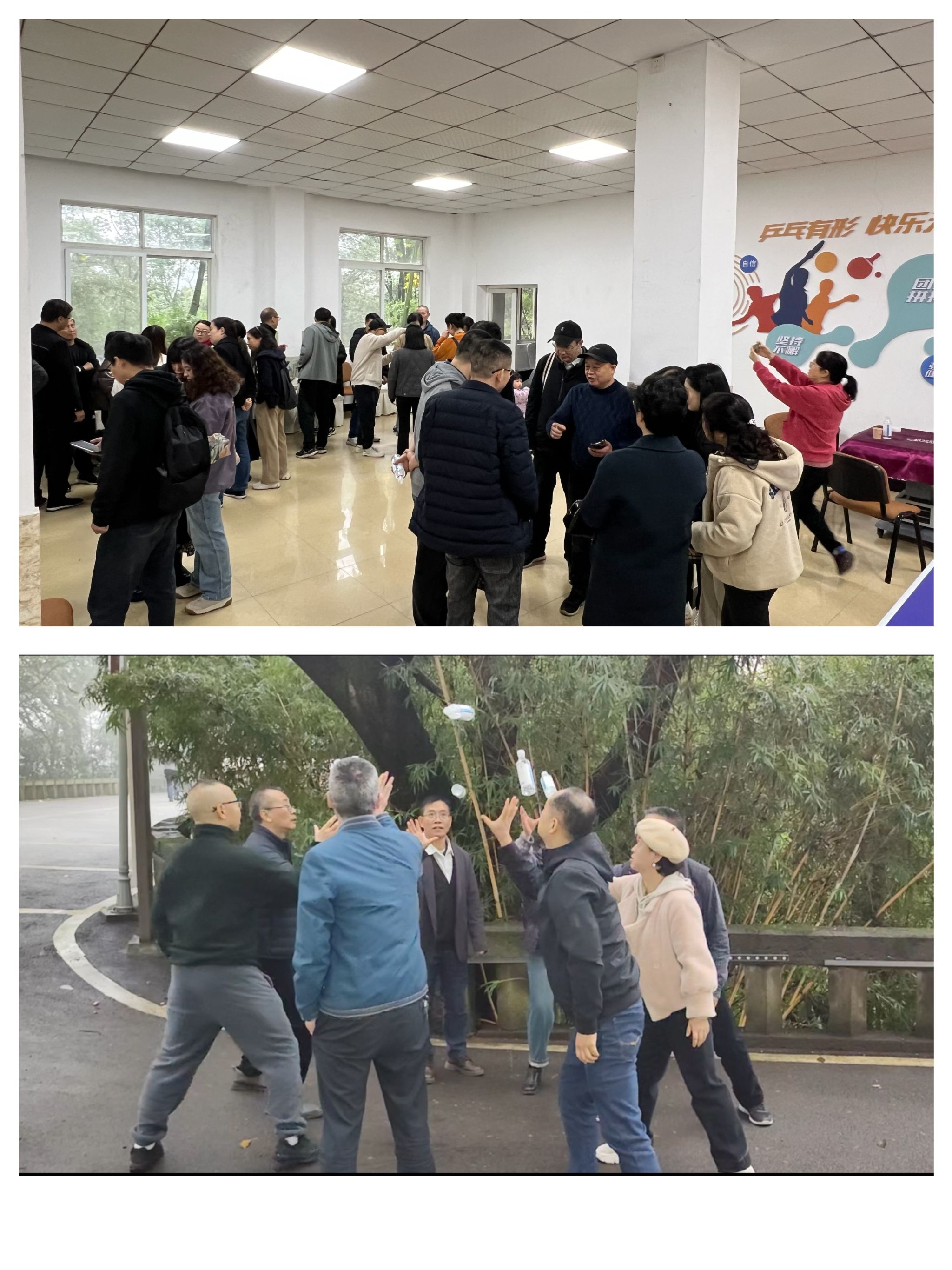 为了发扬团队协作精神,增强集体凝聚力,近日tyc1286太阳成集团工会举行了一年一度的趣味运动会。运动会采用随机分组方式,由分组软件实现,共分成了6个组,每组设组长一名。比赛开始前,工会委员们召集组长开会,解释了“A4纸运乒乓球”“投篮”“猜拳过河”“龙行虎步”“一饮而尽”“画地为牢”共六个项目的比赛规则,然后由组长们召集各队队员进行培训。老师们参与热情很高,态度极其认真,比赛前都会尽量练习,图1是各组长召集队员解释培训和训练的照片。