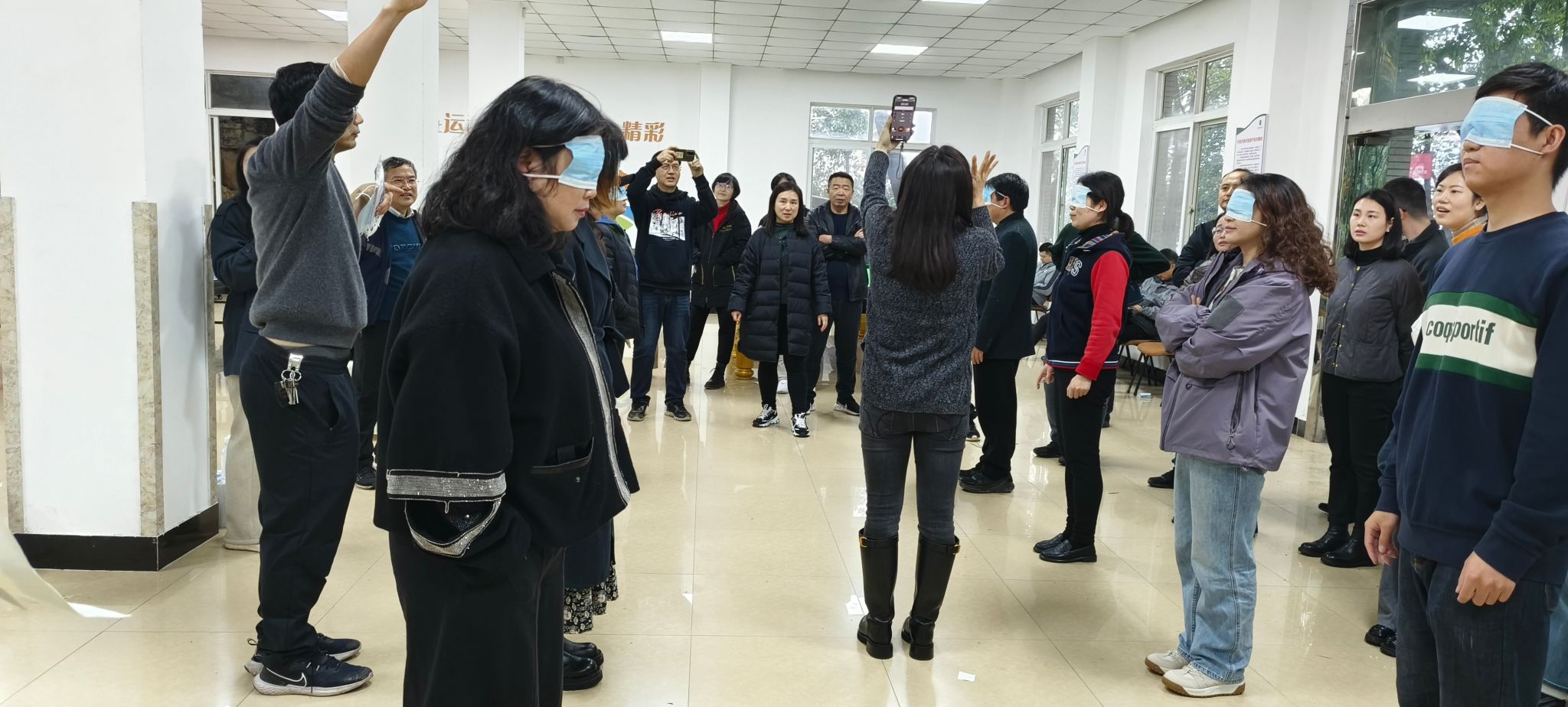 一饮而尽的难点在于抛水传递接力,而且还要组长一次性喝完一瓶水。喝的快,抛接快才能胜出。团队凝聚力在这个节目中体现的淋漓尽致,首先是某些队长年龄偏大,这时团队中年轻力壮者则会毛遂自荐,另外,团队配合抛与接,瓶装水不会掉也是获胜的关键,好几个队都进行了赛前练习,功夫不负有心人,这个项目最高分完成接力只花了48秒,获得阵阵掌声。最后一个画地为牢的节目,每组队员在画好的框中蒙眼原地踏步1分钟,时间结束后计算在框内的人数,人数越多积分越高。很多老师赛前信心满满,说自己踏步走绝不会出框,结果赛后才发现每次都只有1-2人不会出框,大部分都走远啦!