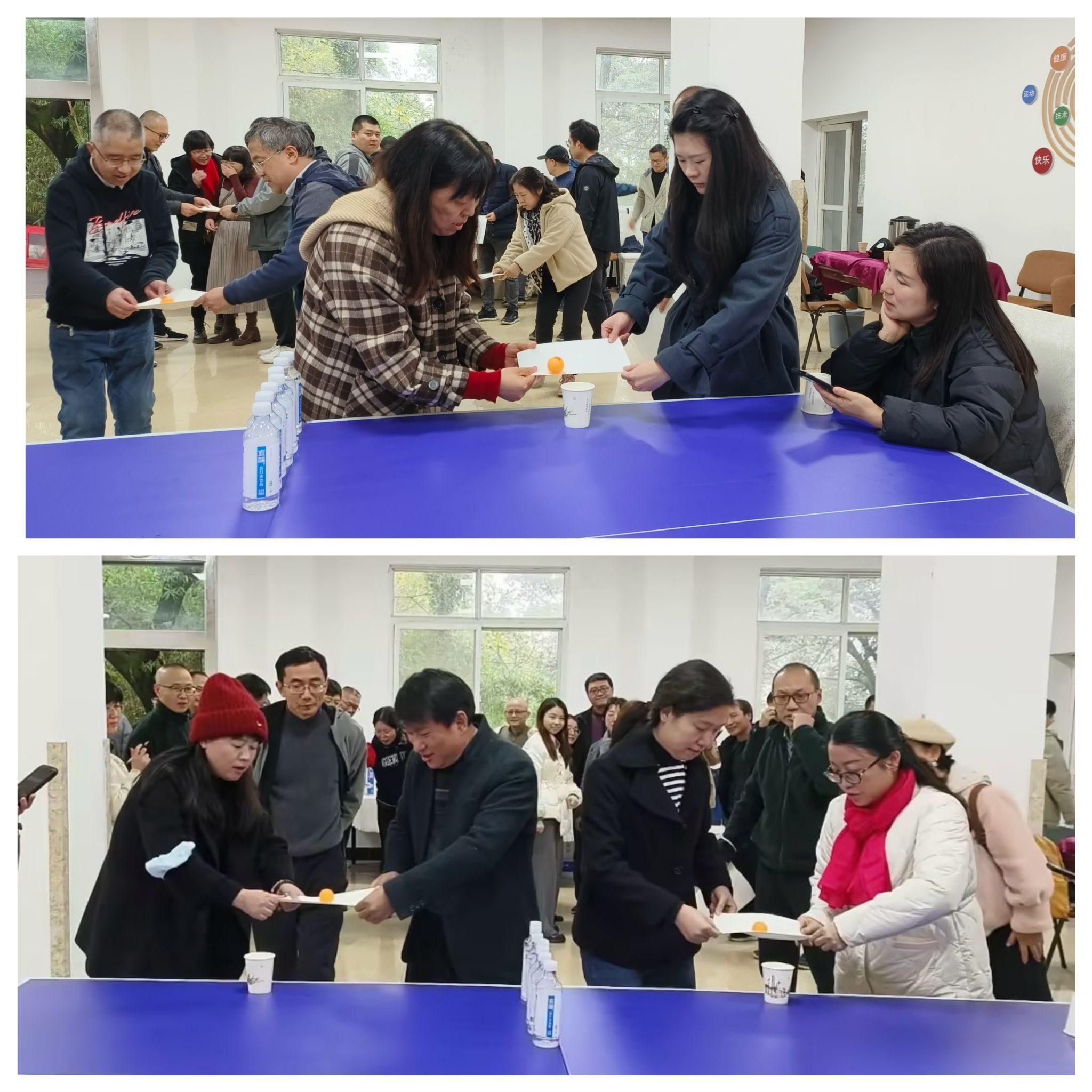 首先进行的是“A4纸运乒乓球”,比赛采用接力方式,团队两人一组,用A4纸将乒乓球运送到指定位置后返回将纸和乒乓球交给下一对队员,运送过程中纸要保持平坦,直至全部队员完成计时结束,用时越少积分越高。随着裁判员一声令下,两位老师小心翼翼用A4纸抬着乒乓球走向终点,由于纸不能折叠,要将乒乓球倒入纸杯里不容易,有时候4、5次都倒不进去,为了抓跑掉的乒乓,甚至把球桌都推动了,引得阵阵爆笑,欢乐的氛围弥漫在大厅。