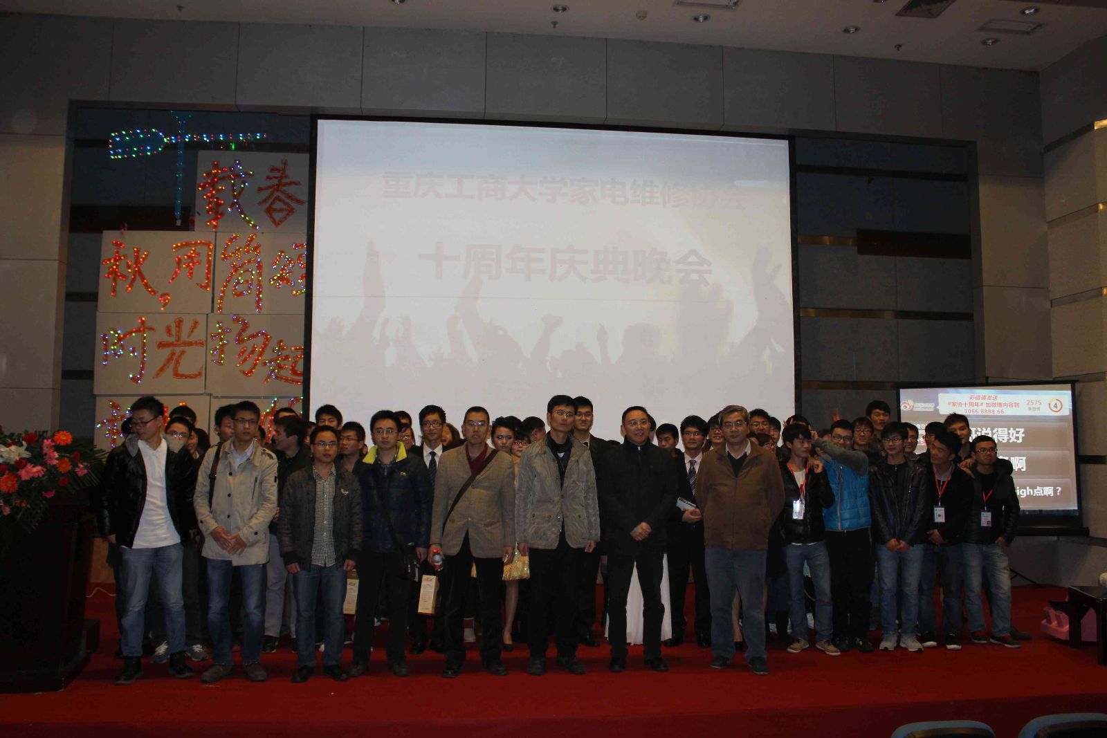 首先特色展示是由家协DIY部做的主题灯饰“十载春秋,用简单时光扬起科技之帆”,在全场闪烁的灯饰中,更好的阐释了家协的宗旨“在服务中锻炼自我,在锻炼中自我成才”。外联部带来的一首《光荣》迎来了“开门红”,让我们感到作为家协人,帮助他人的无比荣耀。接下来深情演绎的《十年》,让我们联想到家协走过的这十年,风风雨雨,大家没有放弃,依然高歌前行。同时我们的家协的“精锐军”DIY部的诗歌朗诵《小红帽的献礼》带给现场观众听觉与心灵的震撼。现场的新浪微薄大屏幕更加增加了晚会的互动性与娱乐性,活动结束后后台统计现场发送微薄总数达到2583条!更加成功的扩大了家电维修协会在网络的宣传与影响力。
