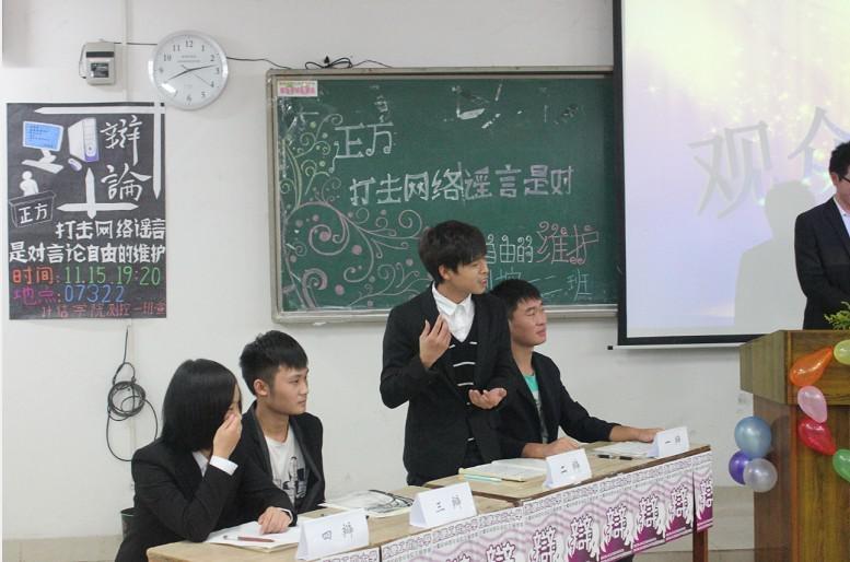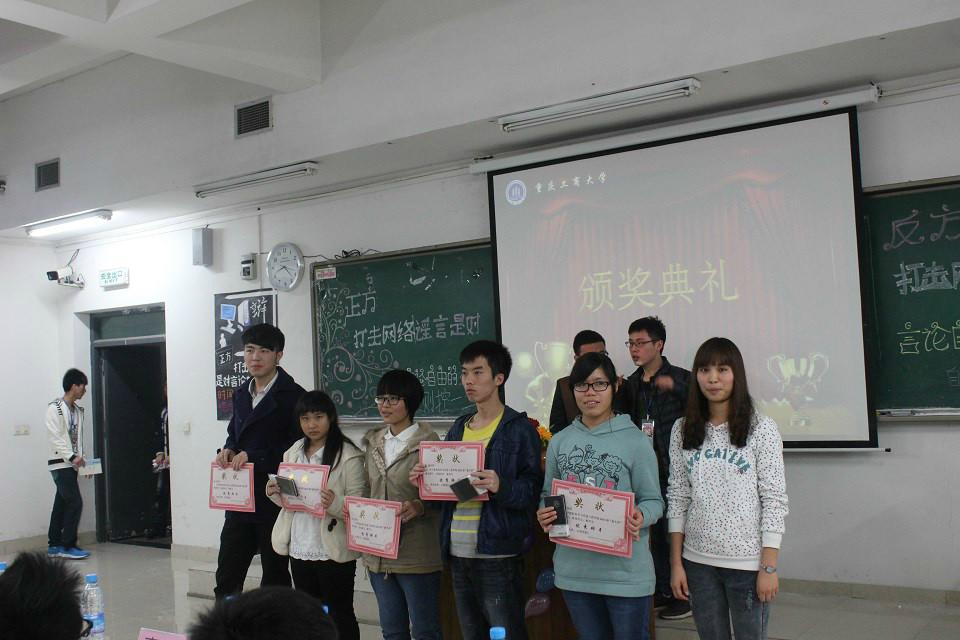 为丰富广大同学的业余生活,让同学们在繁重的学习之余放松心情,开阔视野,计信公司于上月25日开始举行辩论赛,经过三周的激烈角逐,辩论赛进入了决赛阶段。本次决赛辩题为“打击网络谣言是对言论自由的维护还是破坏”,正方为测控专业,反方为自动化专业。双方就己方观点在赛前做好了充分准备,临赛之际丝毫不乱阵脚。比赛一开始就火药味十足,双方在阐述己方观点时与实例相结合,引经据典。双方的三四辩手口若悬河,滔滔不绝,理由观点脱口可出,在场评委与同学们不禁拍手叫好。接下来进入了最精彩的攻辩环节,双方在提问时对对方辩友步步相逼,丝毫不肯示弱。自由辩论环节同样是高潮迭起,正反方的四辩大放异彩,妙语连珠,每一次辩答都赢得场下雷鸣般的掌声。最终测控专业表现出色击败了自动化专业,获得本次辩论赛的第一名。随后进行颁奖环节授予优秀选手与优秀团队证书与奖品以示褒奖,为此本届“新生杯”辩论赛画上了圆满的句号。