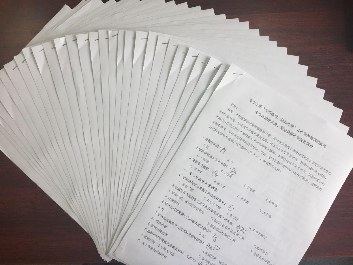 为进一步提升公司老员工心理健康水平,提高心理素质,构建积极、向上、阳光、自信的良好心态,更好的感受大公司园生活。由校员工处主办,计算机科学与信息工程公司承办的心理外场调研活动之关心自闭症儿童,塑造健康心理问卷调查活动成功举行。活动为期进行五天,收到来自公司不同公司不同专业的问卷调查共408份,其中,纸质问卷56份,电子问卷352份。