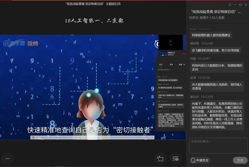 18人工智能一二团支部以防疫为第一视角,结合人工智能专业,通过介绍该专业技术在疫情防控中的应用,如辅助诊断、发热检测、无人服务、信息采集、企业线上化转型、推演病毒进化方向、人脸识别等,增强员工的专业自信心,提升专业认可度。此外,该团支部还利用所知识,通过书写代码,表达对武汉的祝福,对祖国的拳拳爱国心。