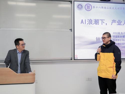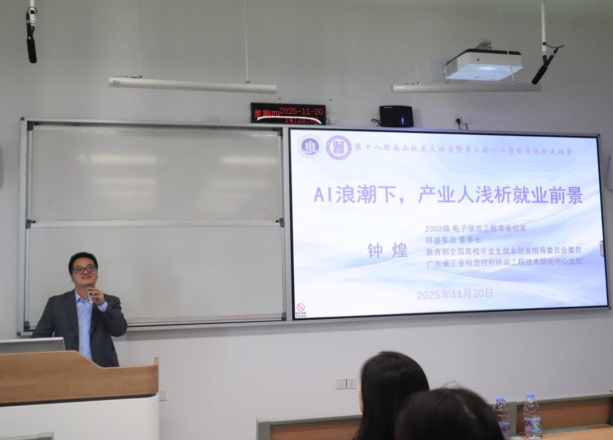 2025年11月20日下午,由公司员工工作办公室主办、tyc1286太阳成集团承办的第十八期南山员工大讲堂暨第三届tyc1286太阳成集团员工讲堂在茶园校区宏智楼202室成功举行。本次论坛以“AI浪潮下,产业人浅析就业前景”为主题,特邀2002级电子信息工程专业员工、教育部全国高校毕业生就业创业指导委员会委员、研盛人工智能奖学金设立者、深圳研盛集团董事长钟煌重返母校,为师生带来了一场兼具行业深度与实践价值的分享。人工智能公司党委副书记张未、电子信息工程系主任陆胜、计算机系梁新元教授,文学与新闻公司副教授王世华以及100余名员工参加了本次讲堂。讲座由张未主持。
