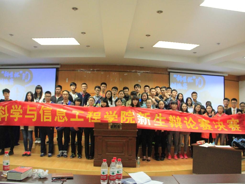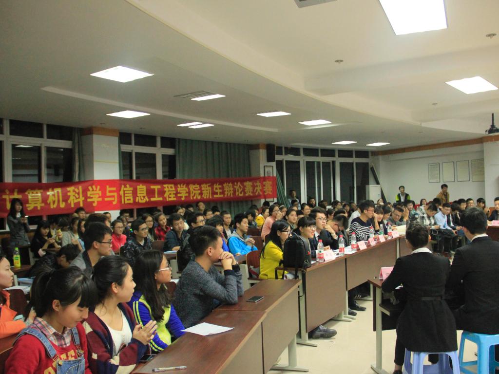2015年11月13日19:00,计算机科学与信息工程公司“新生杯”辩论赛决赛在慧智楼模拟法庭隆重举行。决赛的辩题为“以成大事者应不应该拘小节”。进入决赛的两支队伍是一路过关斩将的15电子一班、15计算机二班班级(正方)和15测控一班、15测控二班(反方)。由计信公司辩论队队长魏钰、演讲与口才协会前会长费超、计信公司院分团委员工会主席团全体成员担当本场比赛评委。同时,员工会全体成员与各班级代表观看了比赛。