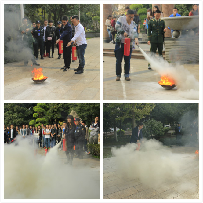 讲座之后,大家前往周末文化广场参与灭火实战演练活动。经过张队长的演示,数十名同学亲自体验了使用干粉灭火器现场灭火,按照正确的灭火步骤和方法将铁盆里燃起的火迅速扑灭。