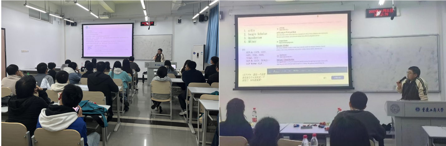 第三位主讲人,2022级研究生金鑫,分享了丰富实用的学术资料网站和工具,详细解读了撰写论文、发表论文的整个流程。他说:“如果论文只看懂50%,那么剩余的50%就藏在代码中。”他告诫学弟学妹们,科研的道路并非一帆风顺,我们应当更成熟地应对学术挑战。