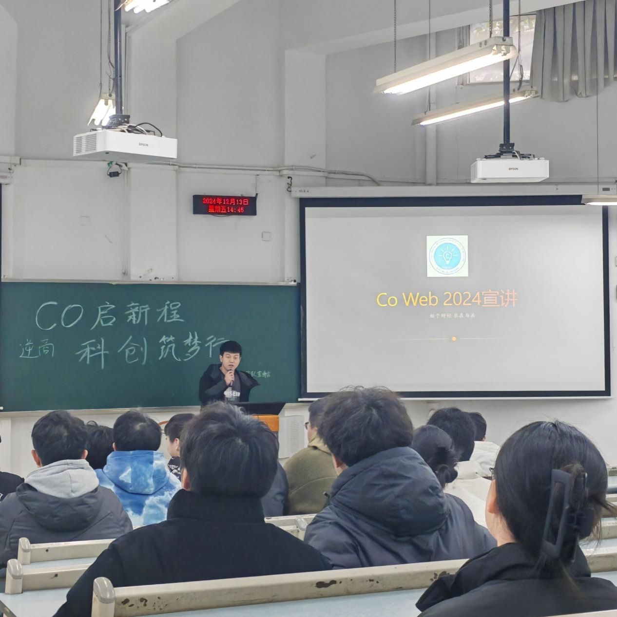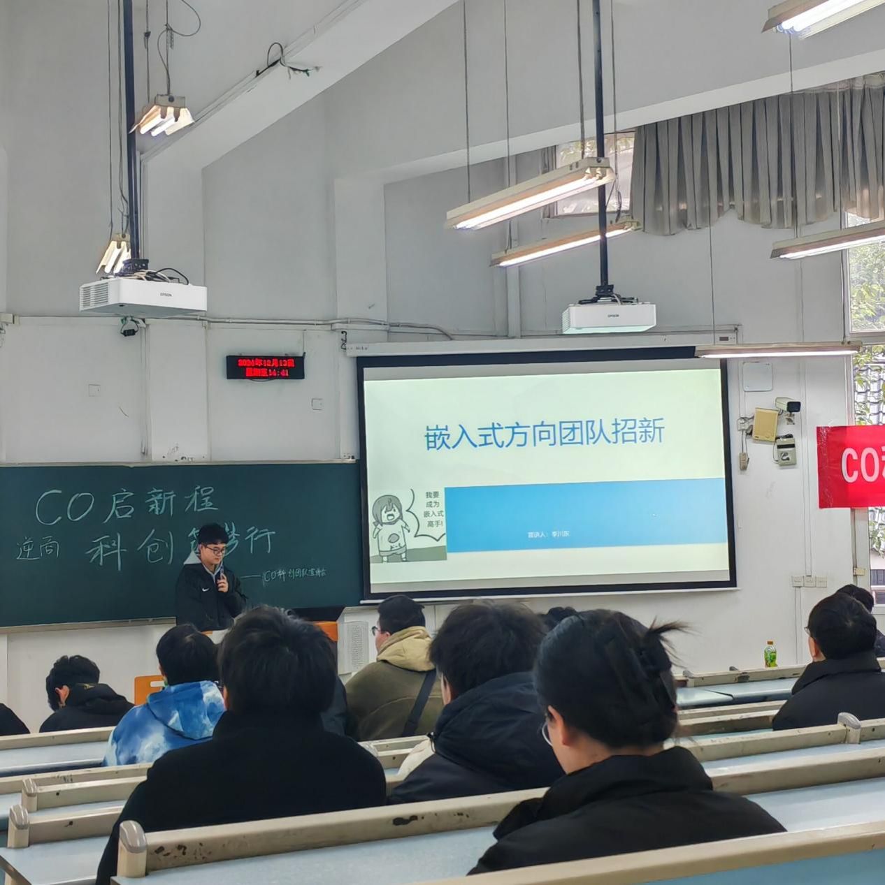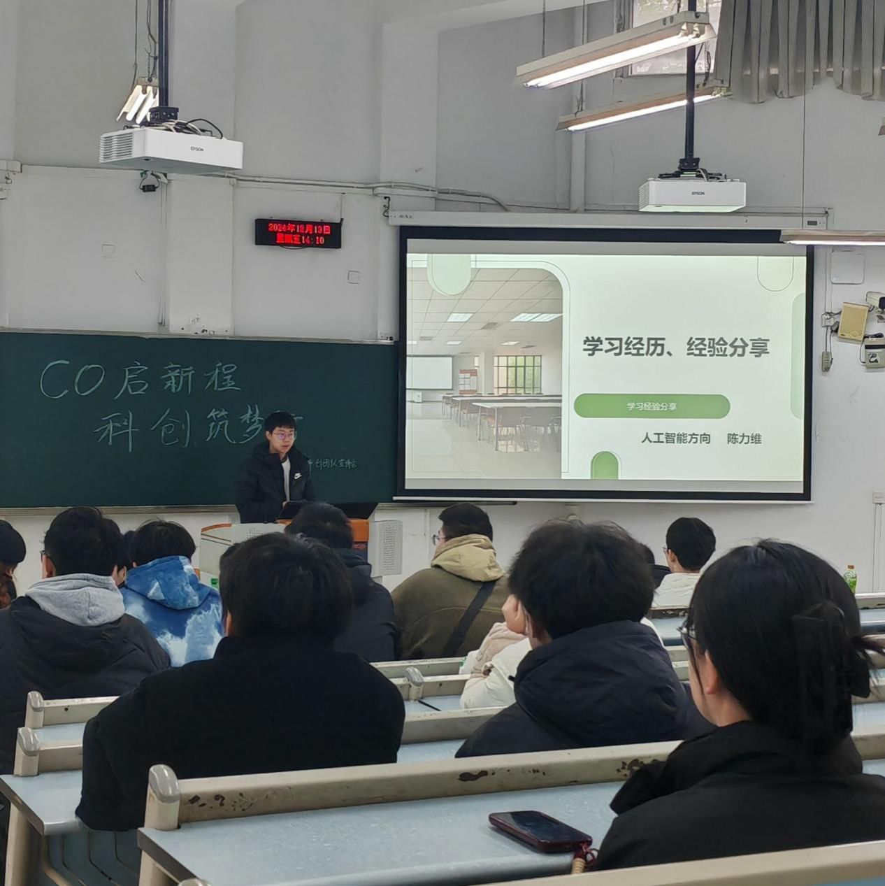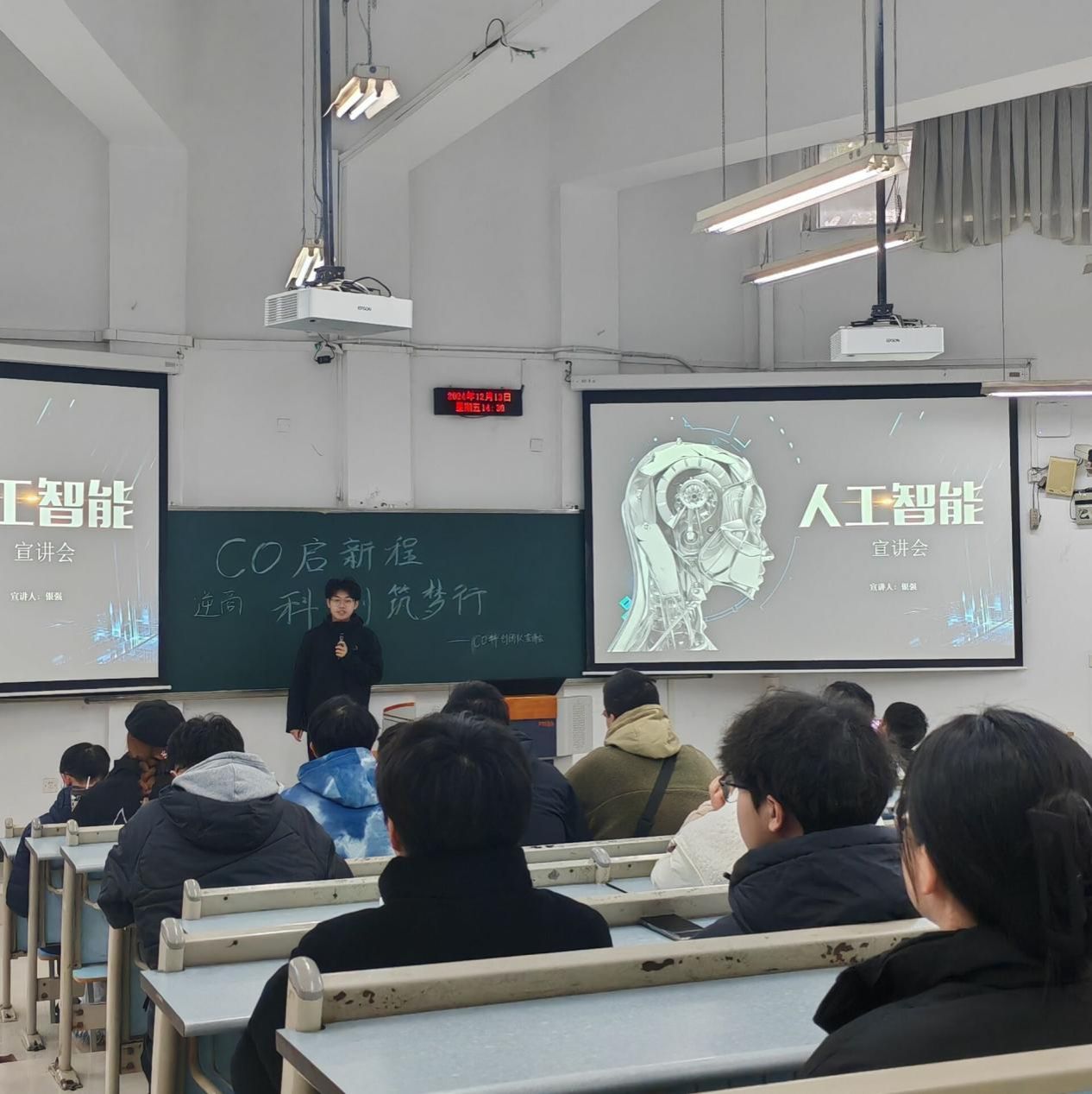 陈潘昕怡简单的进行活动开场后,陈慧婷结合自身学习经历讲述技术学习经验及竞赛心得。陈力维重点围绕竞赛经验和科研经历进行了分享,帮助大一新生规划未来发展路径。陈潘昕怡通过讲述CO历程、团队构成、团队荣誉、团队技术方向四个板块加深了同学们对CO科创团队的认识,并介绍了团队寒假培训的计划。银强以人工智能的基本定义为切入点,详细阐述了人工智能领域的学习路线、资源以及前沿发展,帮助同学们厘清了学习方向与路径。李川东通过自身参赛经历深入介绍了嵌入式方向并给出了学习建议。向明斗用生动的网页展示,详细介绍了Web开发的前后端知识,结合“星河留恋墙”和“量子纠缠”等创新项目,让同学们对Web开发产生了浓厚的兴趣。最后,冉金山通过介绍APP的开发语言和原生库,对APP方向进行了详细的解读以及学习建议的传授,并展示了相关实战项目。