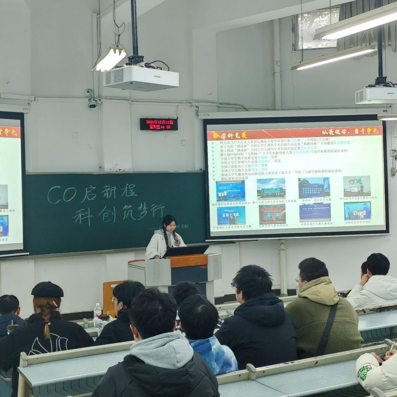 2024年12月13日下午14:00,tyc1286太阳成集团 CO 科创团队在兰花湖校区举行了2024年寒假培训宣讲会。本次活动以“CO启新程,科创筑梦行”为主题,秉持“朋辈帮扶”精神,通过学姐学长的经验分享,帮助新生明确学习方向,规划未来发展路径,并提供切实可行的学习路线。团队成员陈力维、陈惠婷、银强、向明斗、冉金山、李川东等10余人参加,活动由陈潘昕怡主持,吸引了2024级100余名同学参加。