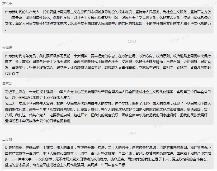 支部员工王丹妮表示:“历史的画卷,在砥砺前行中铺展;伟大的事业,在继往开来中推进。二十大的召开,是对过去的总结,也是对未来的谋划。我们曾庆祝中国共产党成立一百周年、中华人民共和国成立七十周年,曾见证整体脱贫、全面小康,曾经历疫情防控高效推进、国家领土和尊严坚定维护……一件件大事、一次次创举,无不体现大党大国领袖的政治魄力、使命担当。而新时代的我们立足于未来,更应以饱满的奋斗姿态、坚定的意志品质,助力全面建成社会主义现代化强国、实现第二个百年奋斗目标!”