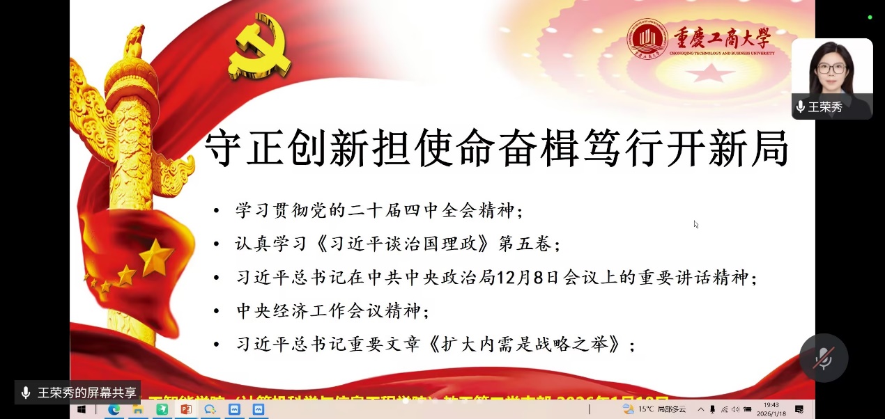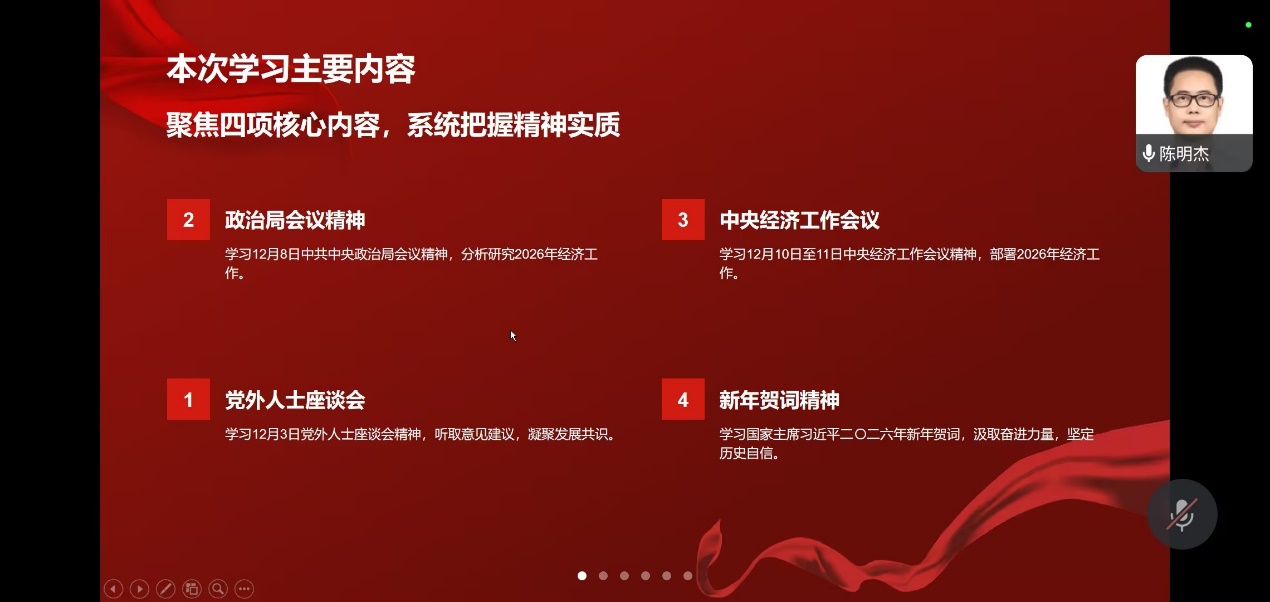 会议首先进行了政治理论学习,由支部委员陈明杰带领大家深入学习了多项重要内容。与会人员重点学习了2025年12月3日的党外人士座谈会精神,旨在凝聚发展共识;接着研讨了2025年12月8日中共中央政治局会议的相关精神,以分析研究2026年的经济工作;同时也讨论了2025年12月10日中央经济工作会议的要点,并学习了习近平主席在2026年新年贺词中的重要精神。